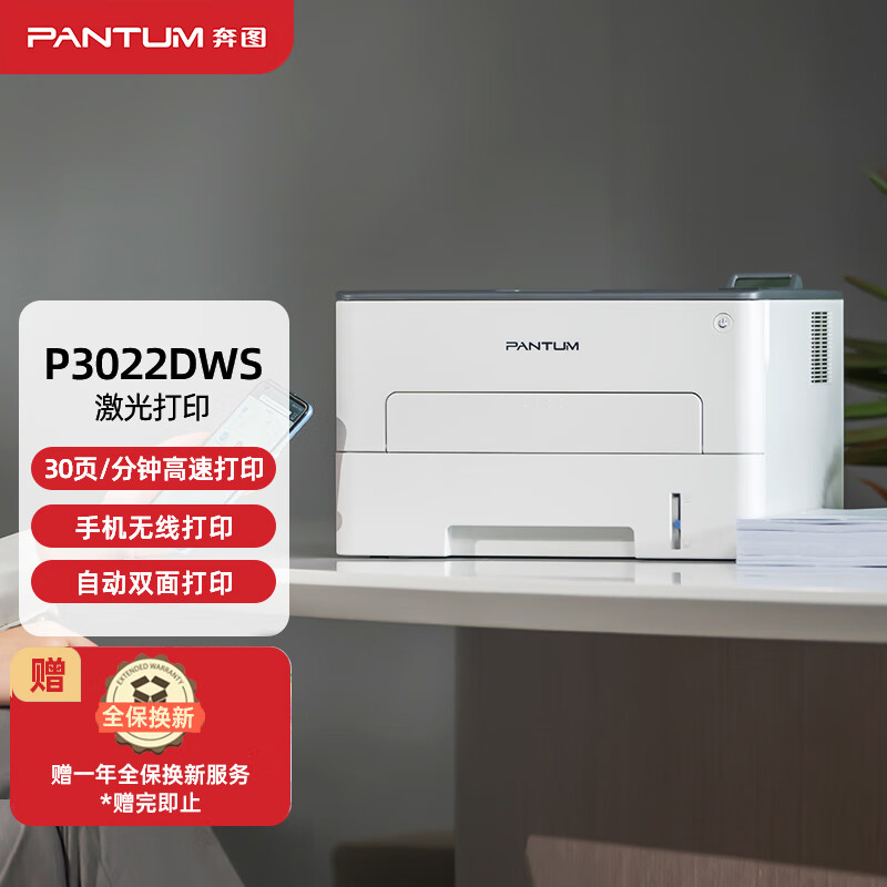 奔图(PANTUM)P3022DWS黑白激光打印机 商用无线办公 自动双面高速打印价格:999.00元!
