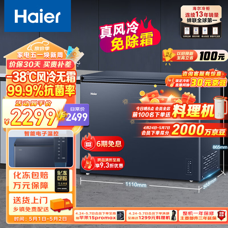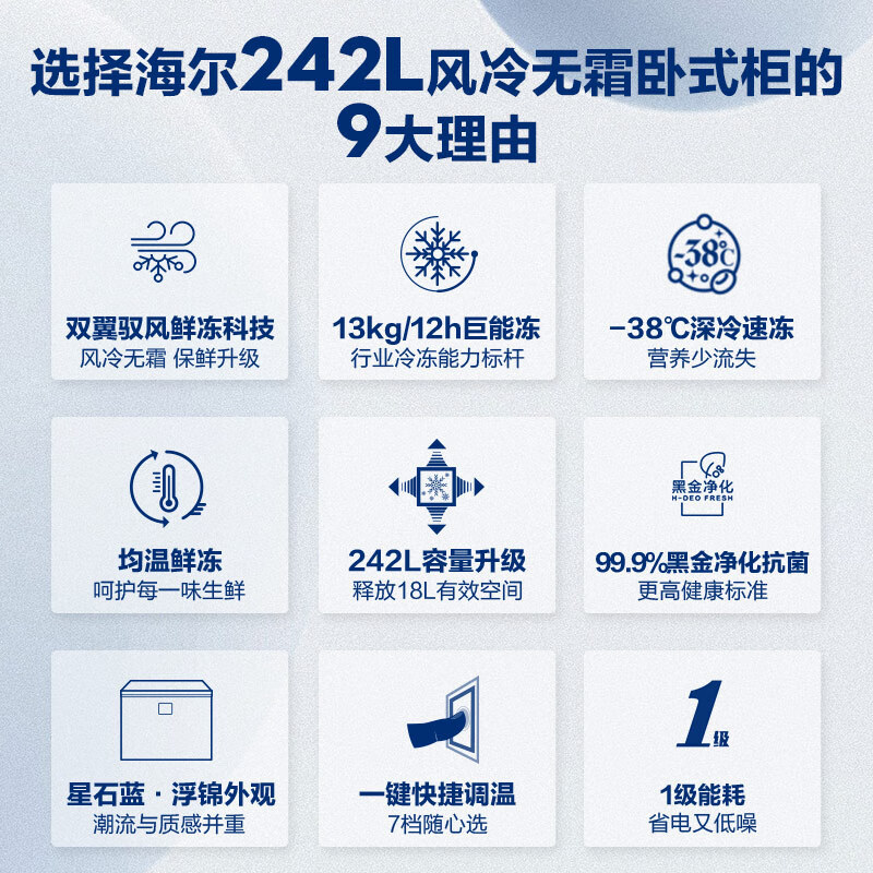 海尔(Haier)242升风冷无霜冰柜家用商用一级能效省电保鲜全冷冻卧式冷柜-38°深冷BC/BD-242WGHED以旧换新价格:2499.00元!