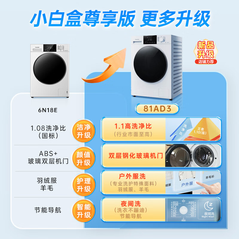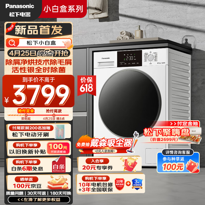 松下滚筒洗衣机全自动 超薄全嵌 【小白盒】10公斤 洗烘一体 温水泡沫净 活性银除菌XQG100-81AD3价格:3799.00元!
