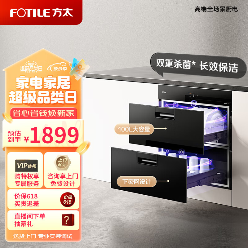 方太消毒柜家用 嵌入式 消毒筷碗柜 100L双层大容量下密网设计二紫外线消毒杀菌 ZTD100J-J51E价格:1899.00元!