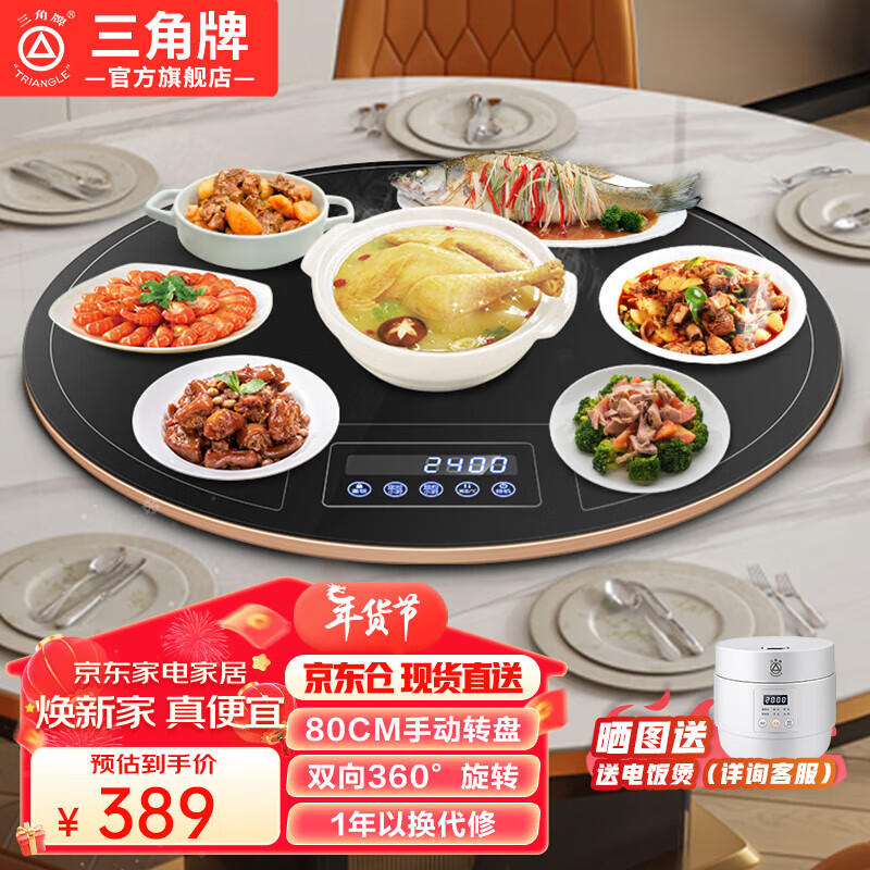 三角牌(Triangle) 暖菜板热菜板加热板饭菜保温板电磁炉多功能带火锅暖菜转盘自动旋转饭菜餐桌 【80CM】手动转盘丨不带火锅加热价格:429.00元!
