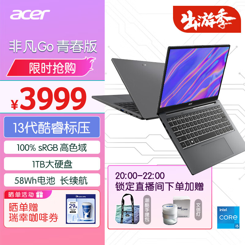 宏碁(acer)非凡Go青春 13代酷睿标压高性能轻薄本 14英寸办公笔记本电脑大学生 (i5-13500H 16G 1T 高色域)灰价格:3999.00元!