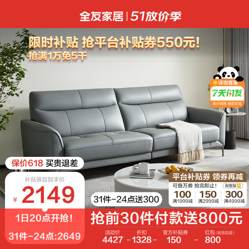 全友家居 真皮沙发 现代简约小户型双人轻奢风直排皮艺沙发客厅102710价格:4427.14元!