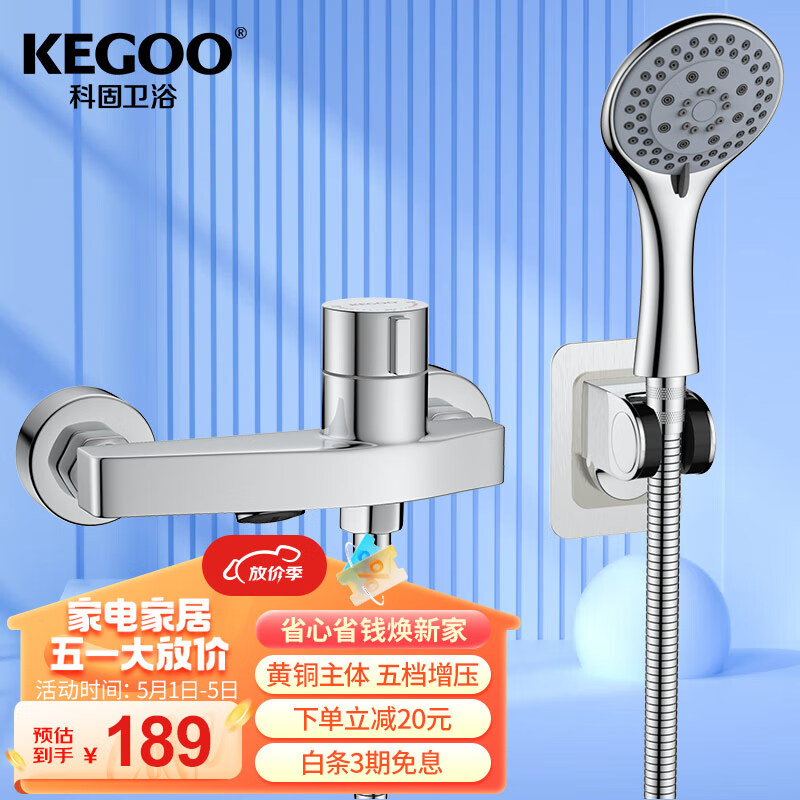 科固(KEGOO)淋浴水龙头手持喷头软管三件套 浴室冷热混水阀简易花洒套装K3008价格:209.00元!