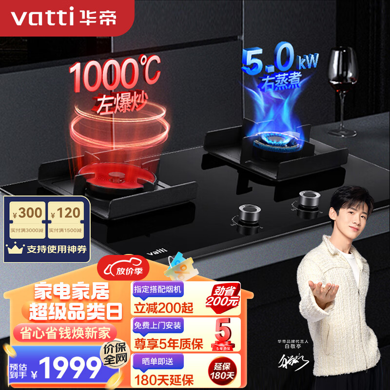 华帝(VATTI)燃气灶(天然气)家用鸳鸯灶双灶具 70%热效率 分区烹饪 5.0kW猛火 钢化玻璃 JZT-i10062B价格:1999.00元!
