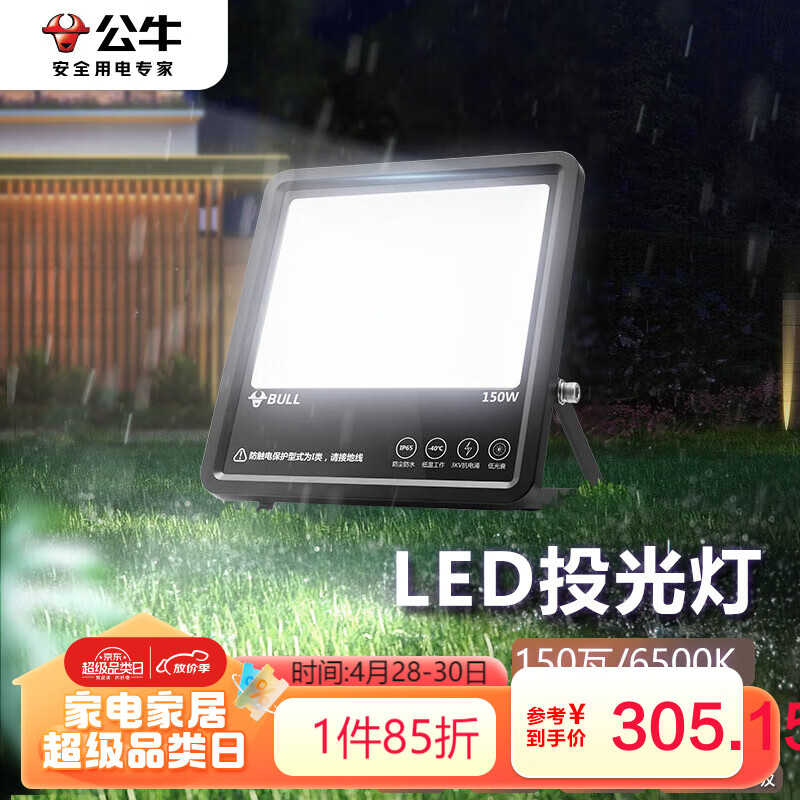公牛(BULL)LED投光灯户外路灯庭院灯广告牌灯露营灯 IP65防水150W-6500K白光价格:359.00元!