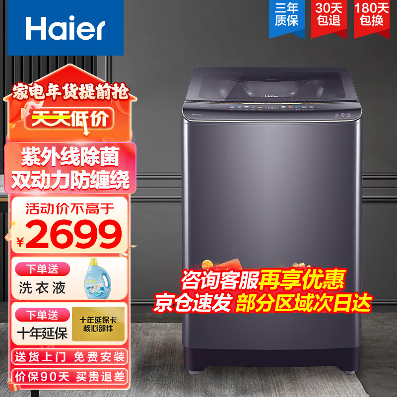 海尔(Haier)直驱双动力防缠绕洗衣机新风紫外线除菌全自动波轮10公斤家用大容量变频节能一级能效BZ368T[家电]价格:2899.00元!