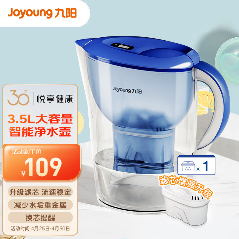 九阳(Joyoung)过滤净水器 家用滤水壶 净水壶(一壶1芯 ) 3.5L(蓝色)四重过滤 智能换芯提醒 JYW-B05E价格:109.00元!