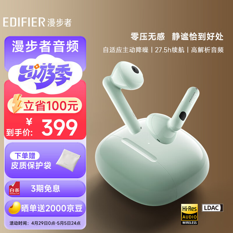 漫步者(EDIFIER)Lolli3 ANC 真无线主动降噪蓝牙耳机 半入耳自适应主动降噪 蓝牙5.3 适用苹果小米华为 青绿色价格:399.00元!