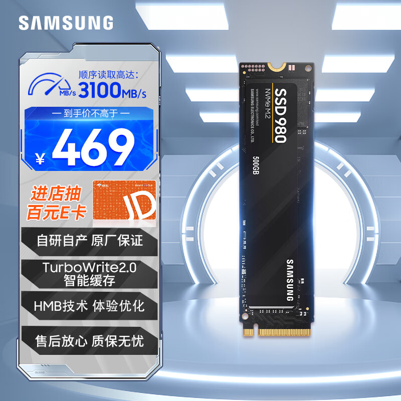 三星(SAMSUNG)500GB SSD固态硬盘 M.2接口(NVMe协议) AI电脑配件 读速3100MB/S 980价格:469.00元!