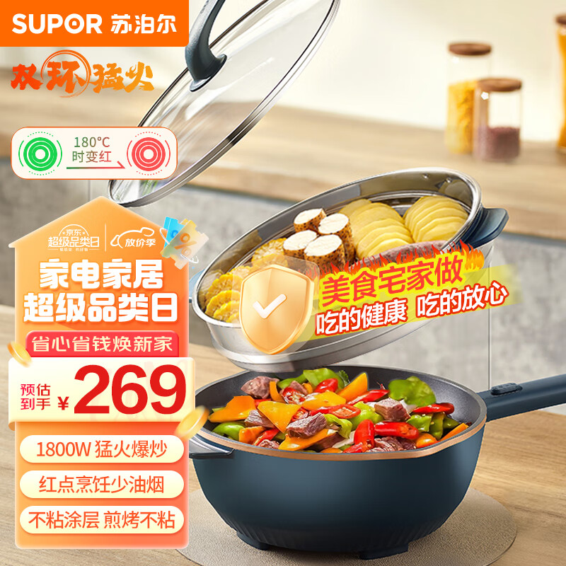 苏泊尔(SUPOR)电炒锅 电火锅 电煮锅 电蒸锅 家用多功能 蒸煮 炒菜智能火红点 不粘多用途锅CJ32A825D配蒸笼价格:269.00元!