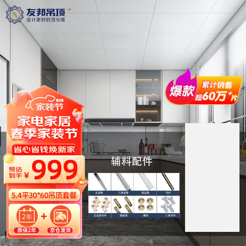 友邦(YOUPON) 集成吊顶铝扣板包安装300*600厨房阳台卫生间家用大板吊顶铝扣板 【5.4平-含辅料】30*60风雅白价格:1499.00元!