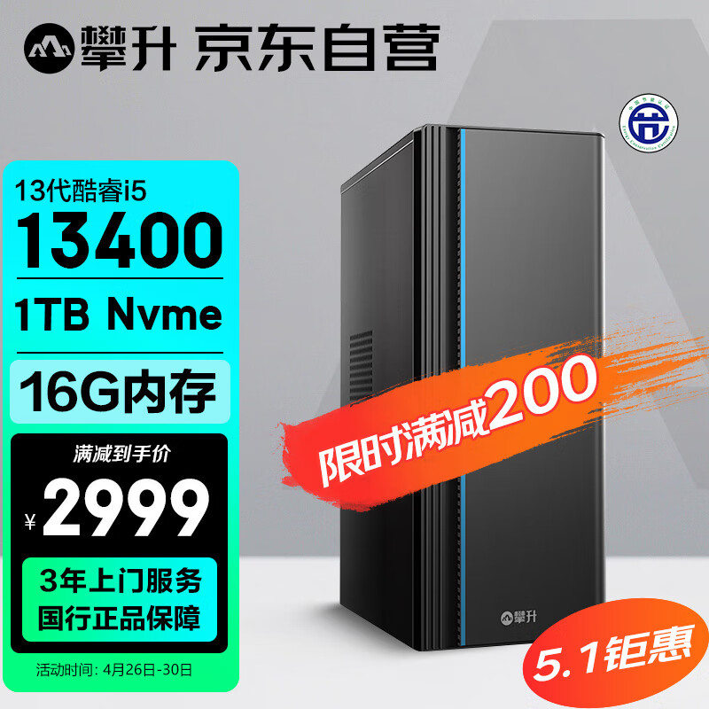 攀升 商睿3 办公商用家用台式电脑台式机组装电脑主机全套(13代酷睿i5 16G 1TB WiFi)价格:3199.00元!