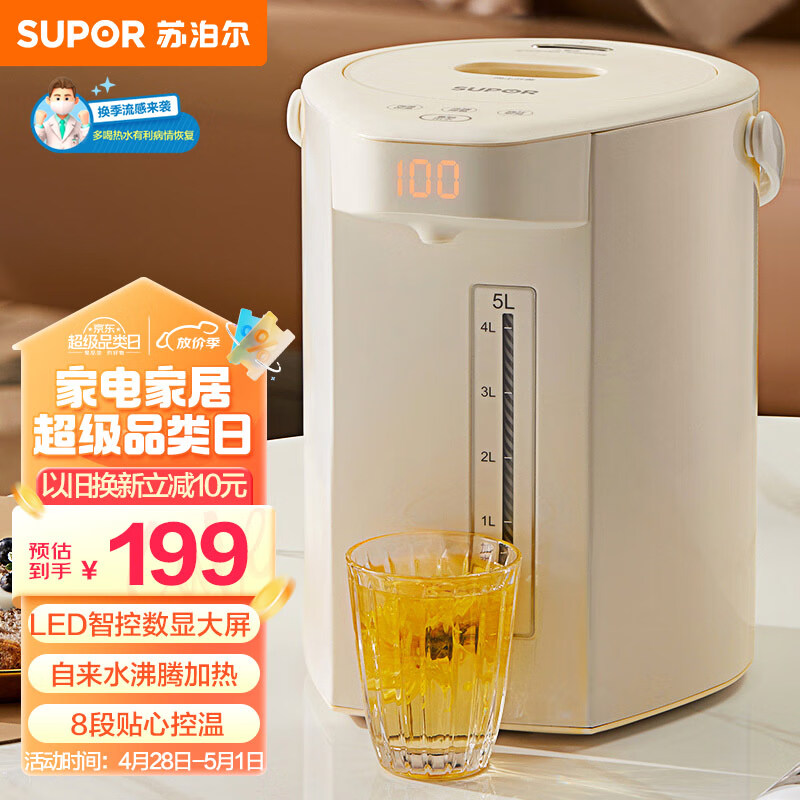 苏泊尔(SUPOR) 电热水瓶热水壶 5L大容量电水瓶八段智能保温恒温304不锈钢 家用电水壶烧水壶SW-50T106价格:199.00元!