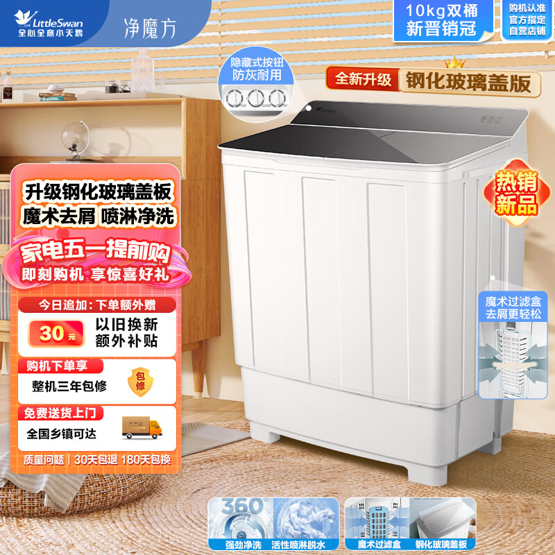 小天鹅(LittleSwan)双桶双缸洗衣机半自动 10公斤大容量 喷淋漂洗强力去污 以旧换新 升级玻璃盖板 TP100VH60E价格:749.00元!