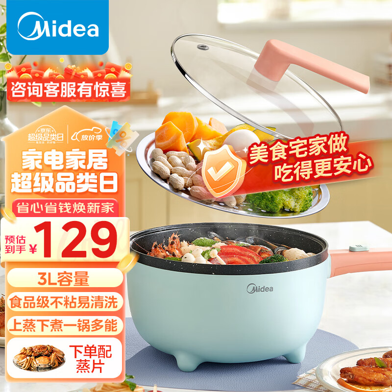 美的(Midea)电炒锅 电煮锅 蒸锅家用电火锅多功能锅3L麦饭石色煎烤电热锅不粘锅多用途锅XZ25X2-101L价格:129.00元!