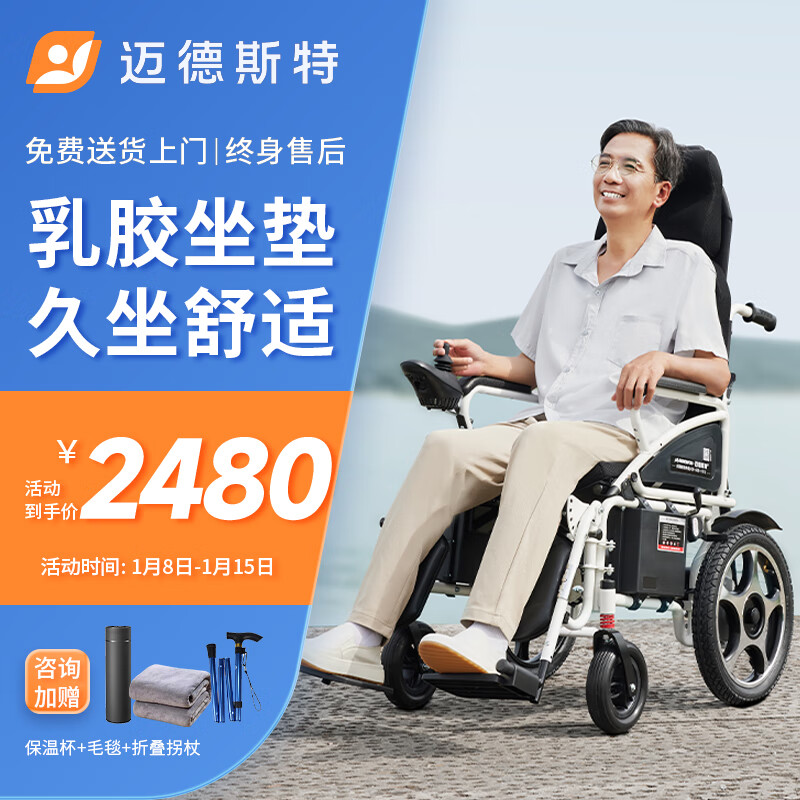 迈德斯特 电动轮椅车全自动折叠轻便老人残疾人便携【自调平躺+乳胶坐垫+可选带坐便】801高靠背-12AH铅酸价格:2880.00元!
