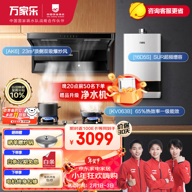 万家乐烟灶热三件套 23立方顶侧双吸油烟机16L四季随温感热水器多件套装AK6+KV063B+16D5S天然气价格:3399.00元!
