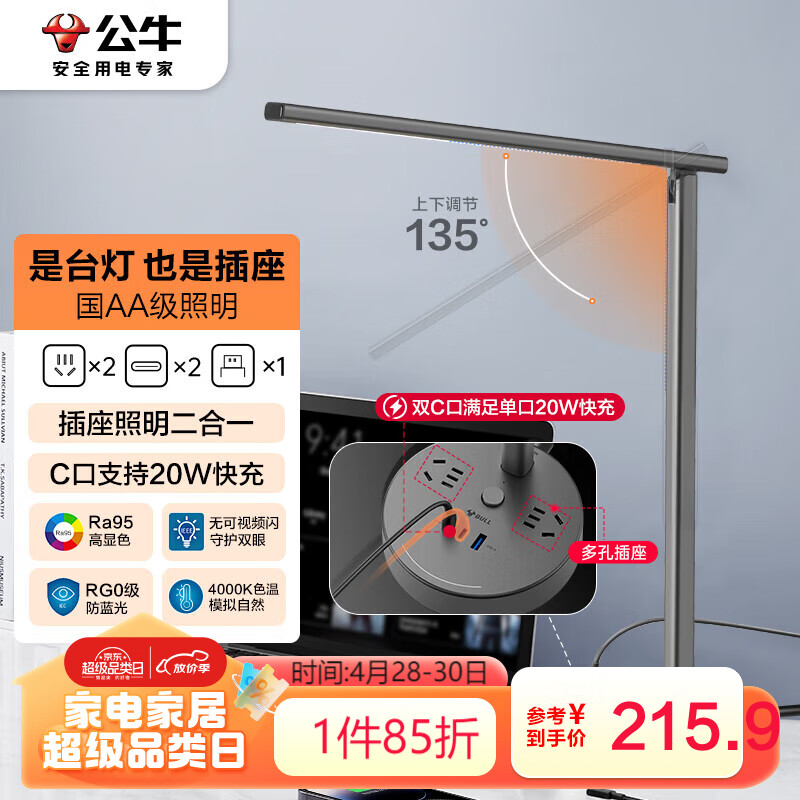 公牛(BULL)插座台灯至臻款国AA级照度GN-X202U深空灰C口20W快充价格:254.00元!