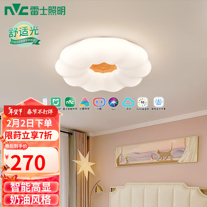 雷士(NVC)led吸顶灯卧室儿童房灯具原木奶油风智能舒适光WHXD24F/F-06价格:428.00元!