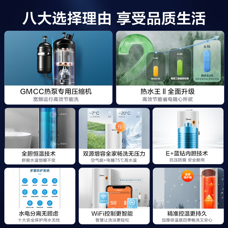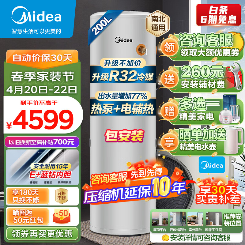 美的(Midea)空气能热水器家用200升R32冷媒节能电辅速热75℃热水王二代RSJF-33/DN8-200D(E2)价格:4899.00元!
