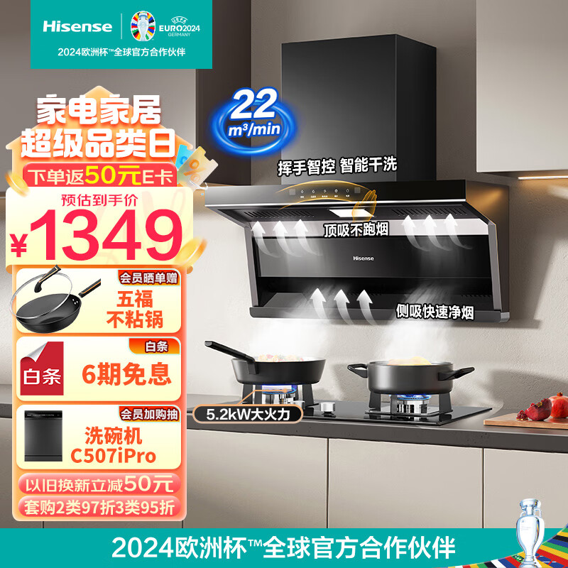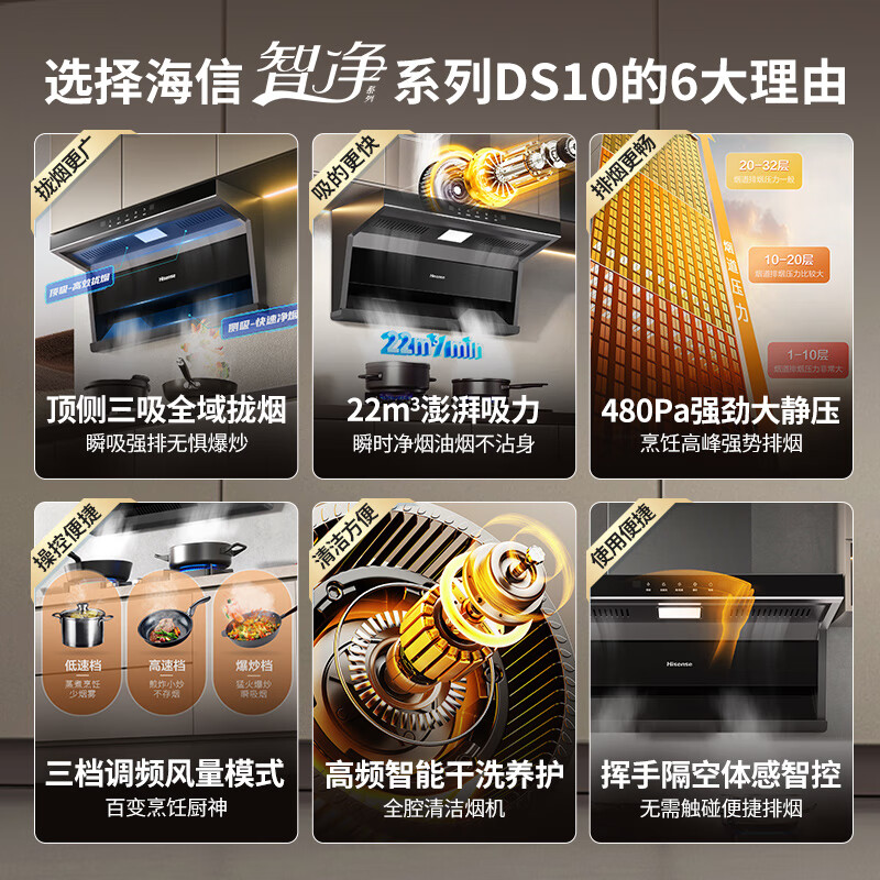 海信(Hisense)顶侧双吸三吸 22立方挥手免拆洗5.2kW燃气灶具 家用烟机燃气灶具套装 智净DS10H+DB31 以旧换新价格:1399.00元!