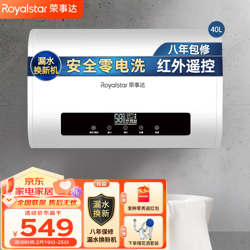 荣事达(Royalstar)电热水器家用 2000w双胆速热卫生间储水式热水器电 纤薄扁桶 一键预约 经济适用 40L 【预约+出水断电】价格:609.00元!
