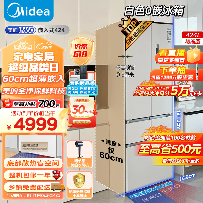 美的(Midea)M60系列424升法式五门多门超薄零嵌入平嵌大容量家用智能电冰箱无霜一级变频BCD-424WFPZM(E)白色价格:5999.00元!