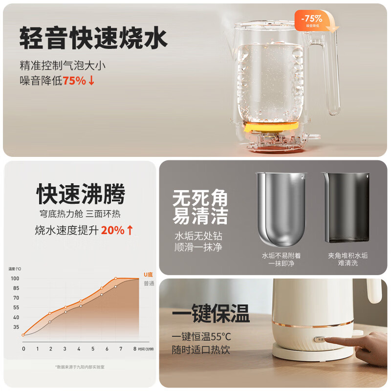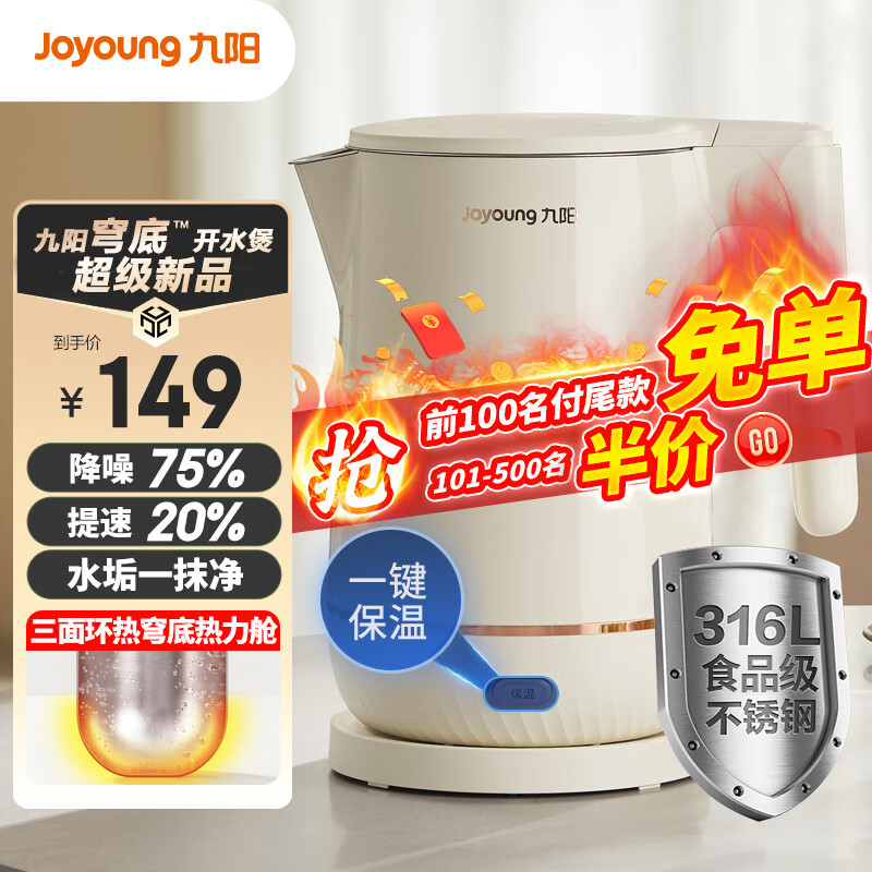 九阳(Joyoung)穹底无死角速静电热水壶烧水壶 U底 1.7L 轻音降噪速沸 易清洁 316L内胆 一键保温开水壶17WU1B价格:149.00元!