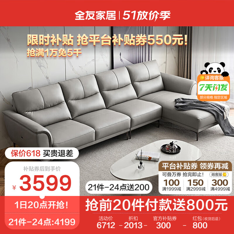 全友家居 转角贵妃沙发客厅现代简约头层牛皮轻奢风真皮艺沙发112011价格:6712.86元!