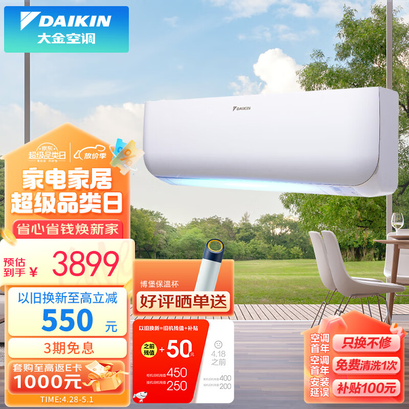 大金空调 14-19㎡适用 新三级能效 大1.5匹 变频 冷暖 家用 壁挂式 以旧换新 FTXB336WCLW价格:3899.00元!