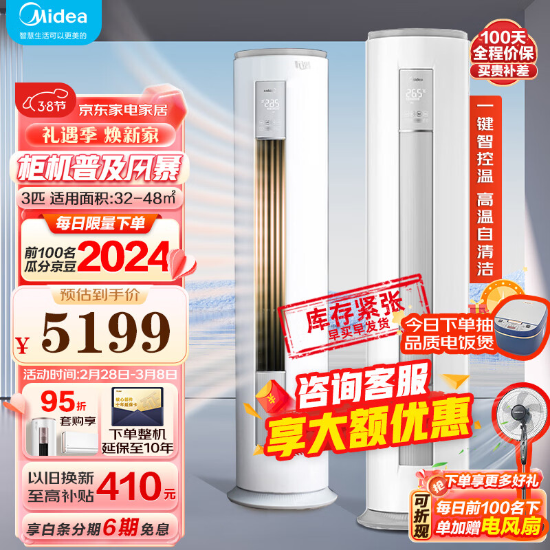 美的(Midea)空调柜机 新能效变频冷暖 强劲除湿 客厅空调立式 自清洁+智能控温 3匹智行II KFR-72LW/N8MJA3价格:5199.00元!
