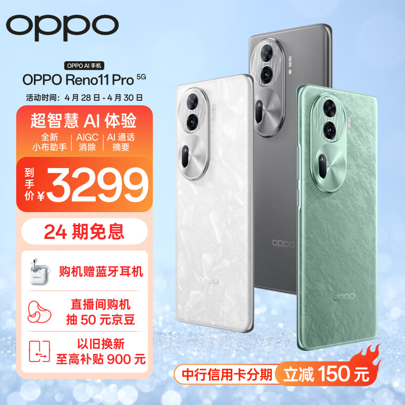 OPPO Reno11 Pro 5000万单反级人像三摄 骁龙8+旗舰芯 12GB+256GB 松石绿 游戏拍照 学生5G AI手机价格:3299.00元!