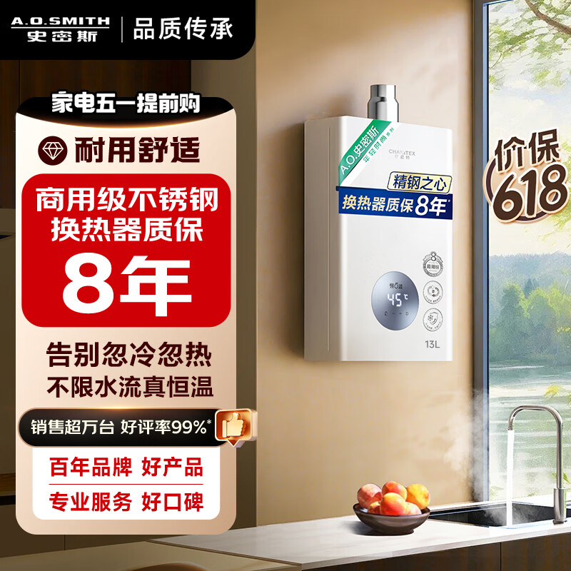 史密斯(A.O.SMITH)佳尼特13升燃气热水器 不锈钢换热器包8年 精控恒温 抗风防冻 家用天然气 JSQ26-TC1价格:2154.50元!