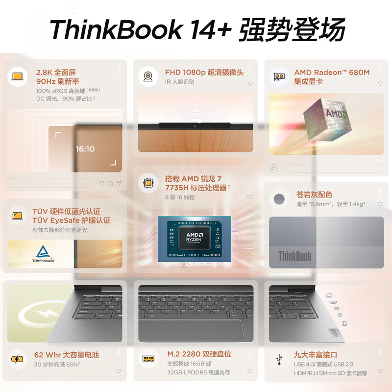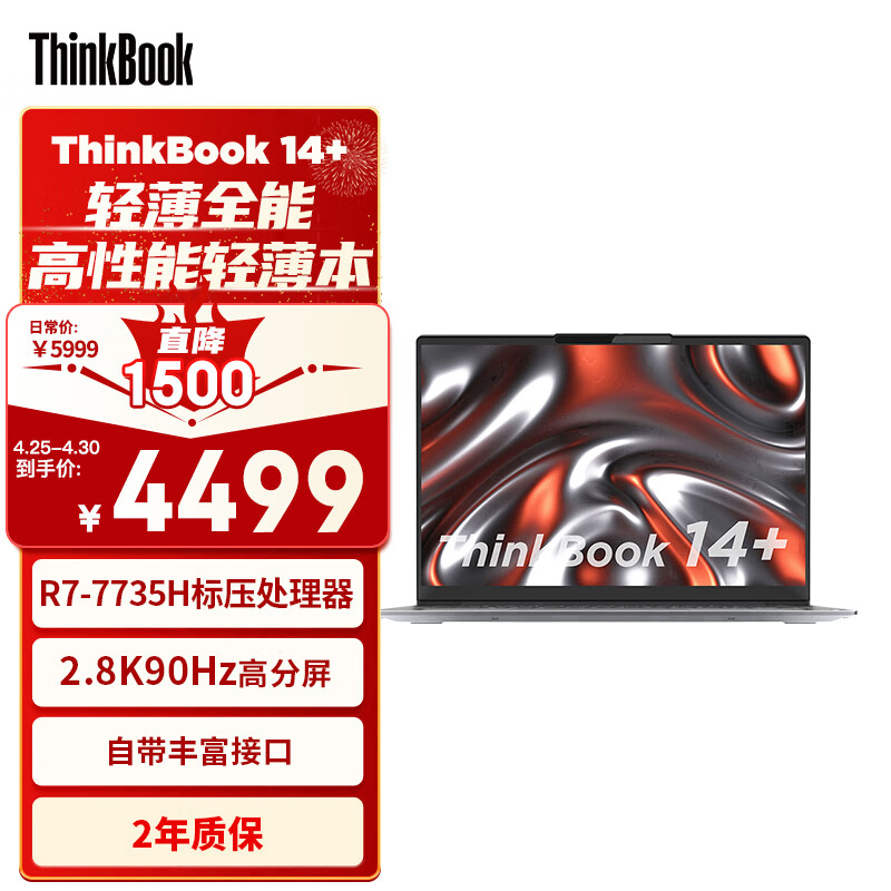 ThinkPad联想笔记本电脑ThinkBook 14+ 锐龙版 14英寸标压便携轻薄办公本 R7-7735H 16G 512G 2.8K 90Hz价格:4499.00元!