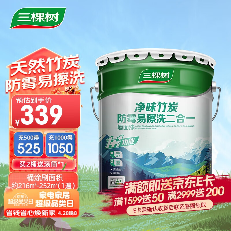 三棵树漆(SKSHU)乳胶漆内墙净味竹炭防霉易擦洗二合一墙面漆室内油漆涂料 18L价格:423.75元!