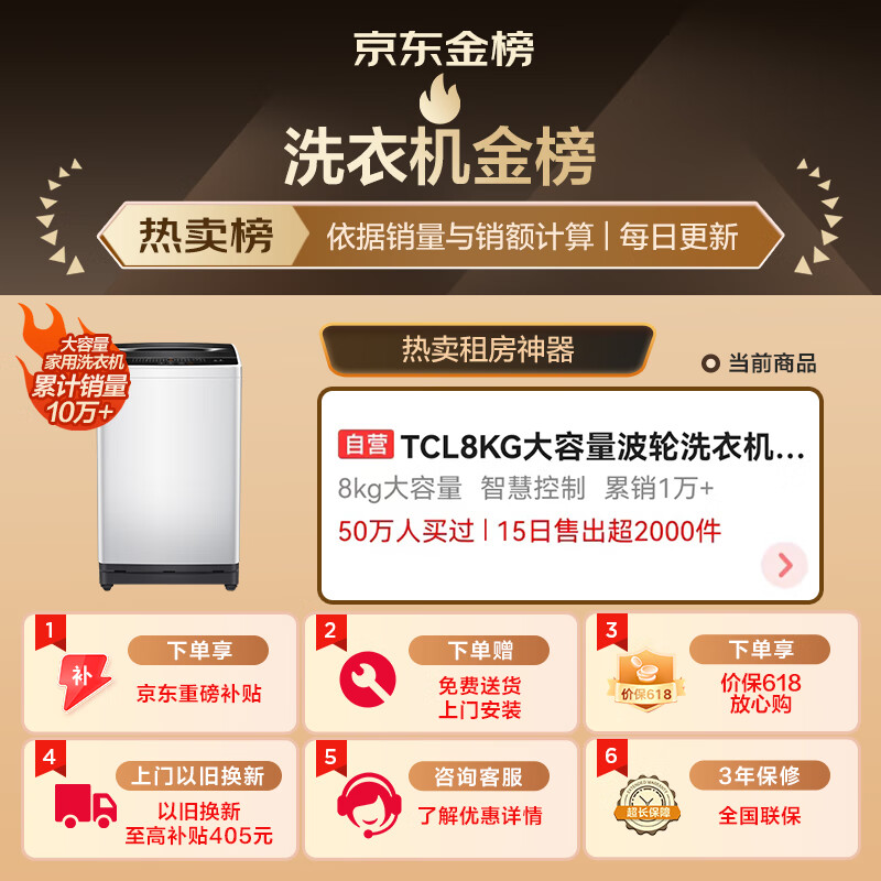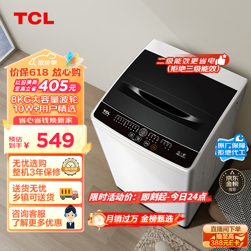 TCL 8KG智控洗衣机L100 大容量波轮 全自动 洗衣机家用 以旧换新 宿舍租房神器 B80L100价格:599.00元!
