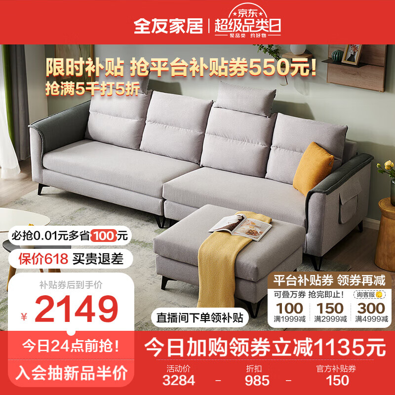 全友家居四人位直排沙发简约一字沙发客厅小户型北欧布艺沙发凳102567价格:3284.29元!