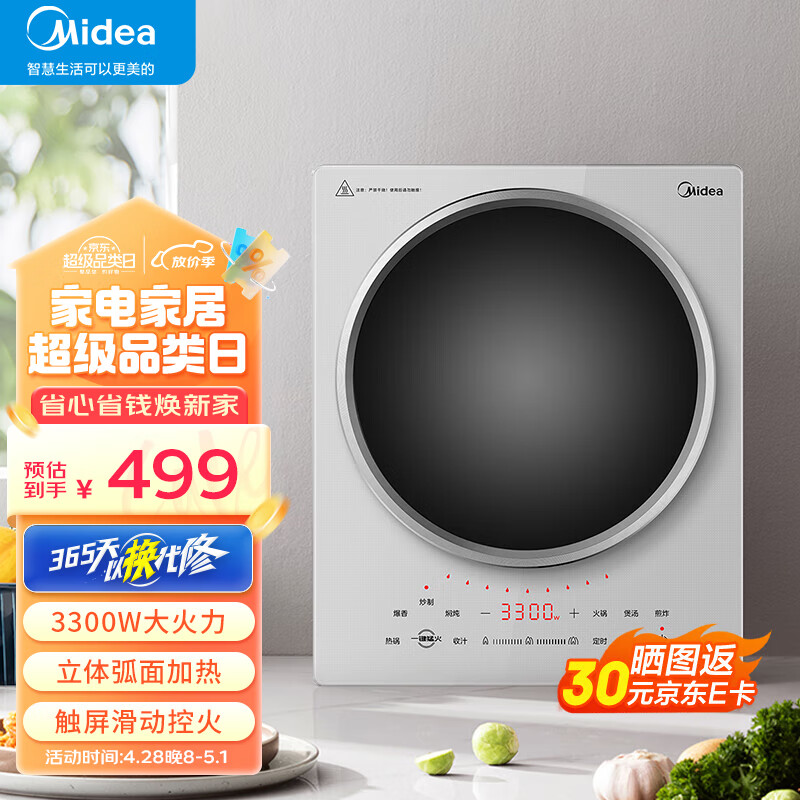 美的(Midea)电磁炉 家用凹面电磁灶 3300W大功率速热触控微晶面板防水保护定时炒锅一体 MC-E33CA11【银色裸机款】 3300W大功率价格:699.00元!