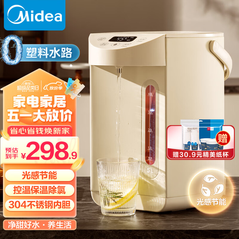 美的(Midea)0塑料水路电水瓶电热水壶304不锈钢5L大容量智能多段温控恒温烧水壶除氯光感节能热水瓶01C价格:279.00元!