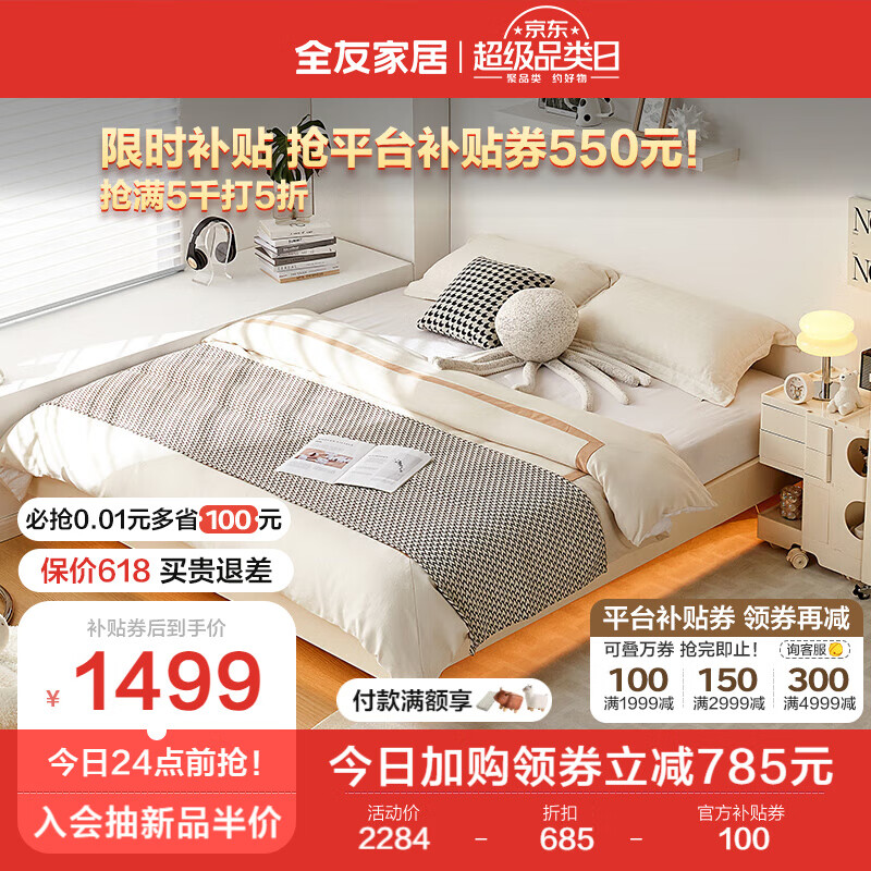 全友家居 悬浮床简约风无床头床双人床卧室感应灯带1.5米框架床129523价格:2284.29元!