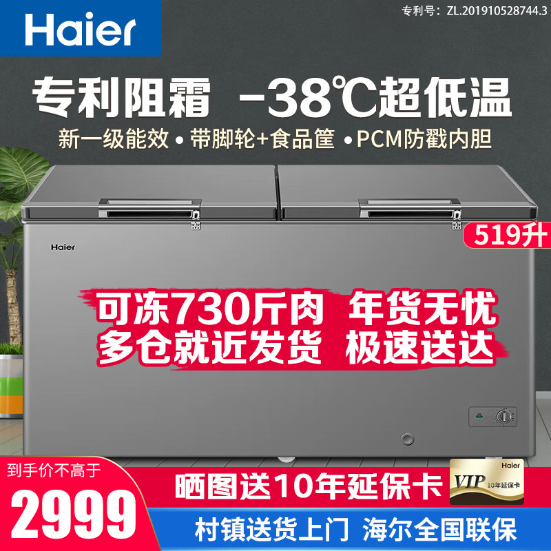 海尔冰柜519升-38度超低温大容量全冷冻家用商用冷藏冷冻两用一键转换阻霜速冻冷柜海鲜保鲜柜价格:2999.00元!