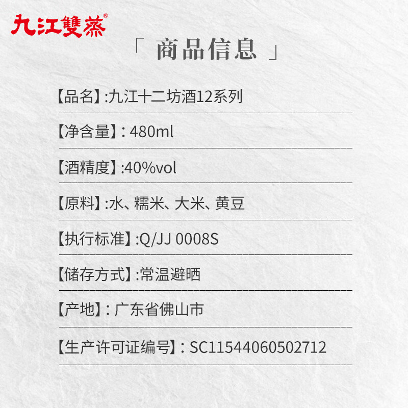 九江双蒸 米香型白酒 40度12年陈十二坊系列480ml 送礼白酒中秋礼盒价格:218.00元!