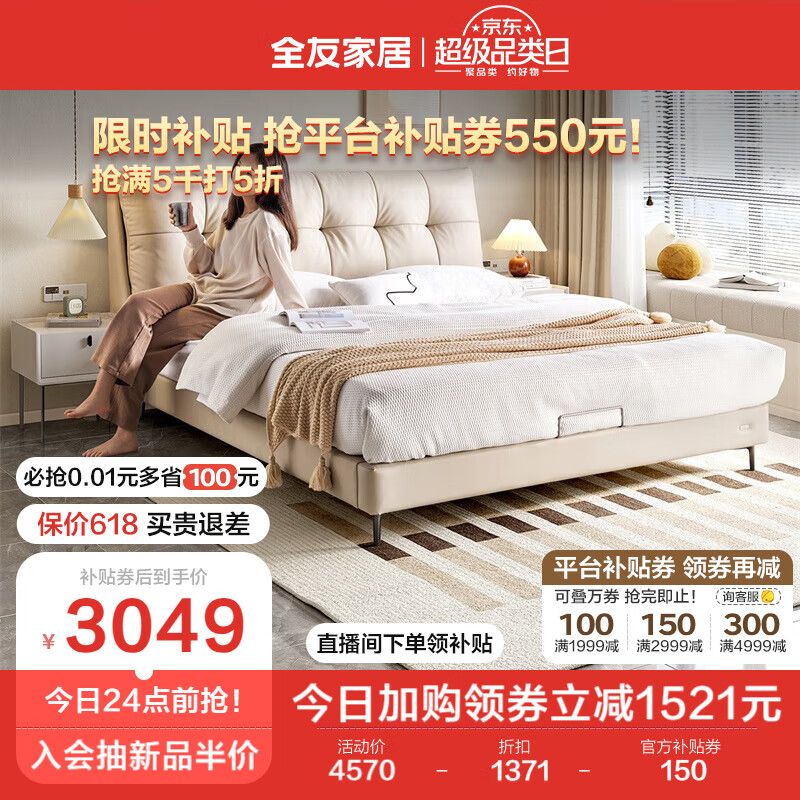 全友家居 奶油风真皮云朵床1.8x2米主卧室家具软包高脚双人大床116026价格:4570.00元!
