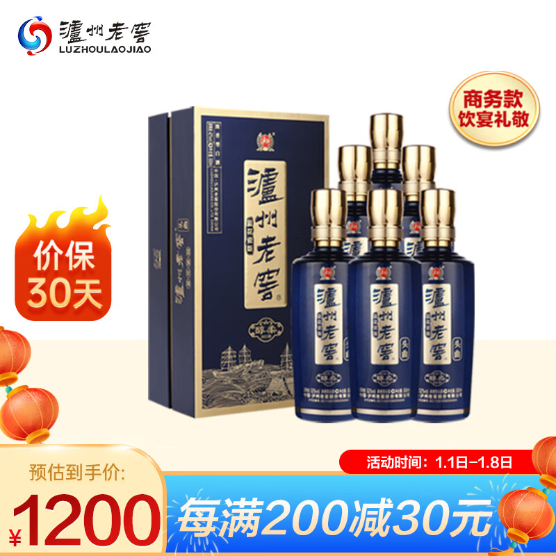 泸州老窖 蓝花瓷 头曲 醇柔 浓香型白酒 52度500ml 6瓶整箱 年货送礼价格:1260.00元!
