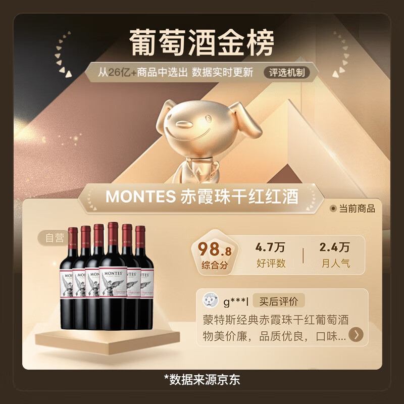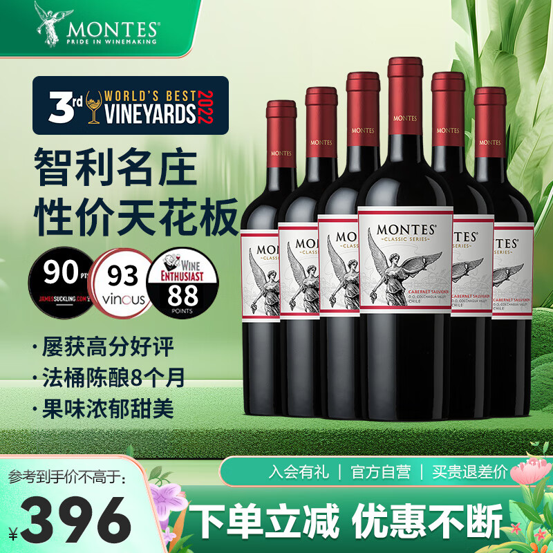 MONTES蒙特斯经典赤霞珠红酒葡萄酒750ml*6整箱日常口粮酒智利原瓶进口价格:396.00元!