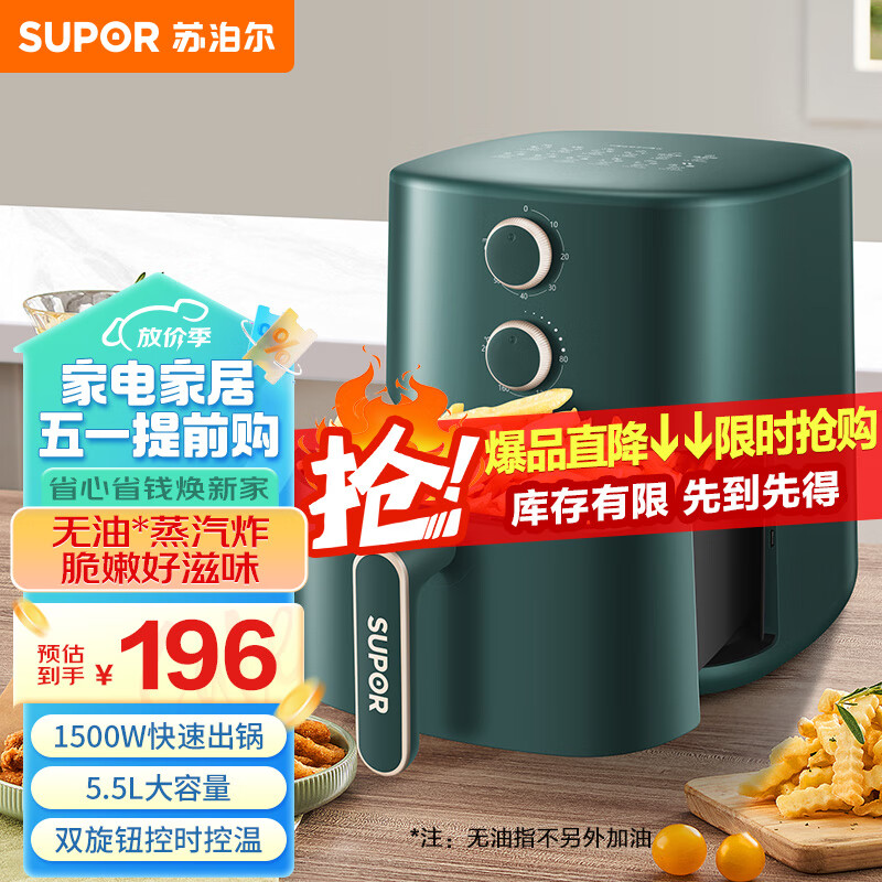 苏泊尔(SUPOR)空气炸锅家用大容量无油低脂煎炸锅精准控温大功率无油烟电炸锅双旋扭控温调时蒸汽嫩炸【5.5升】 5.5L价格:239.00元!