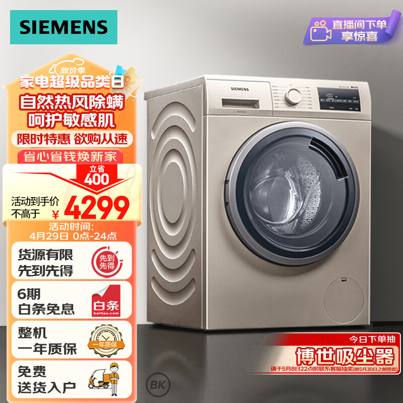 西门子(SIEMENS) 9公斤滚筒洗衣机洗烘一体机 99.99%除菌 专业羽绒洗 智能烘干 XQG90-WN42A1X31W价格:4699.00元!