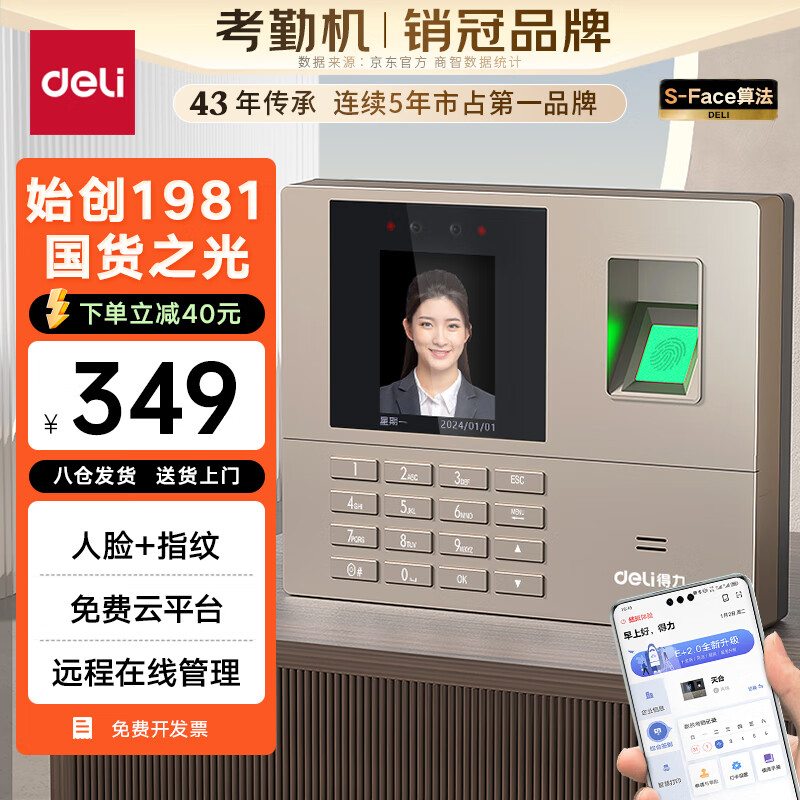 得力智能云考勤机 打卡机人脸+指纹 wifi联网 APP在线管理 实时查看考勤 刷脸考勤机33800CS价格:389.00元!