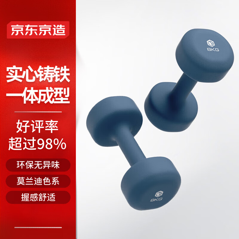 京东京造哑铃 男士女士家用哑铃 彩色浸塑纯铁健身器材 8KG两只装价格:208.00元!